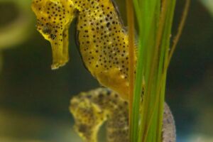 Their courtship ritual involves color changing, while they attach to each other using their tails. These species also mate for life, so they are monogamous by nature. Dwarf seahorse, as other species are ovoviviparous, and the female releases about 55 eggs into the male`s brood pouch where he will fertilize and carry them until hatching and giving birth 11 days or so later.