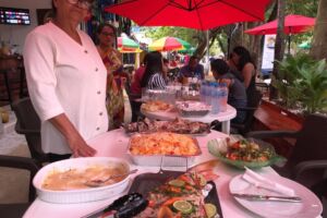 The location is easy to find, about 30 meters away from the parking lot in El Batey, and visitors can reserve a parking area by calling the restaurant ahead of time, also reserve tables ( there are 5 ). This restaurant includes its own bathroom, and it is decorated with Taino and African cultural motifs. Best in the menu is the red snapper and grouper ( steamed with veggies ), the Tempura shrimp and grilled lobster.